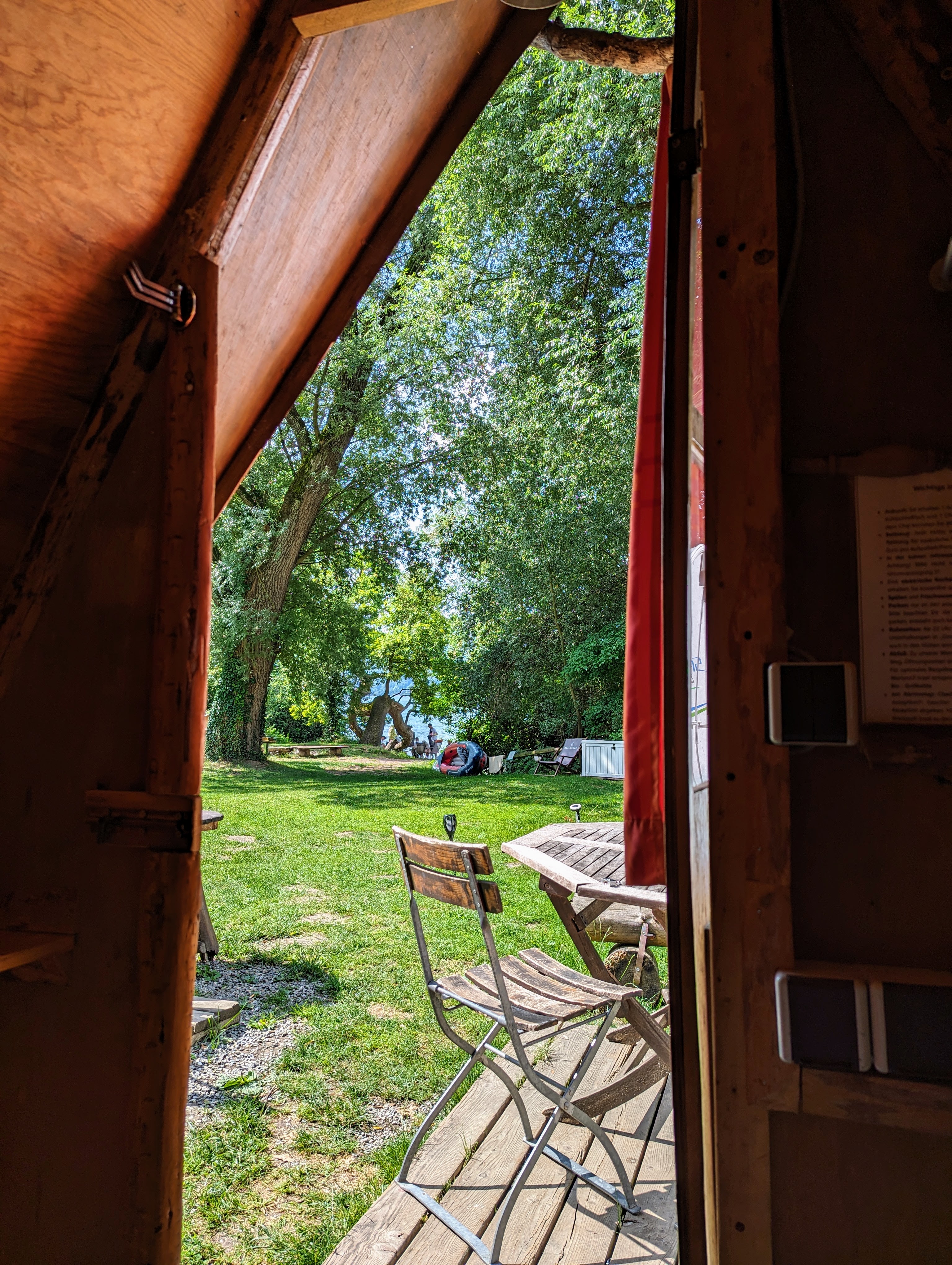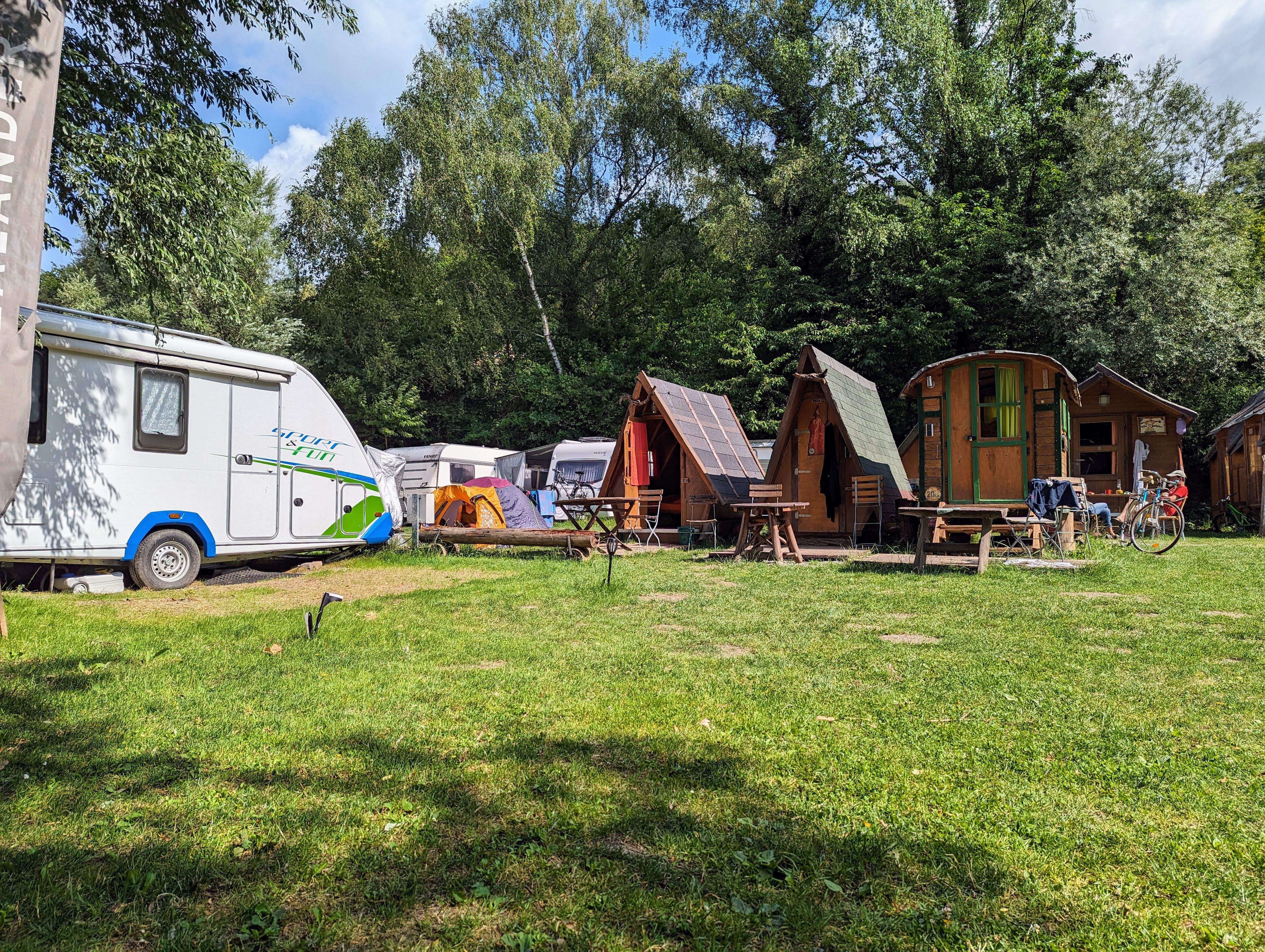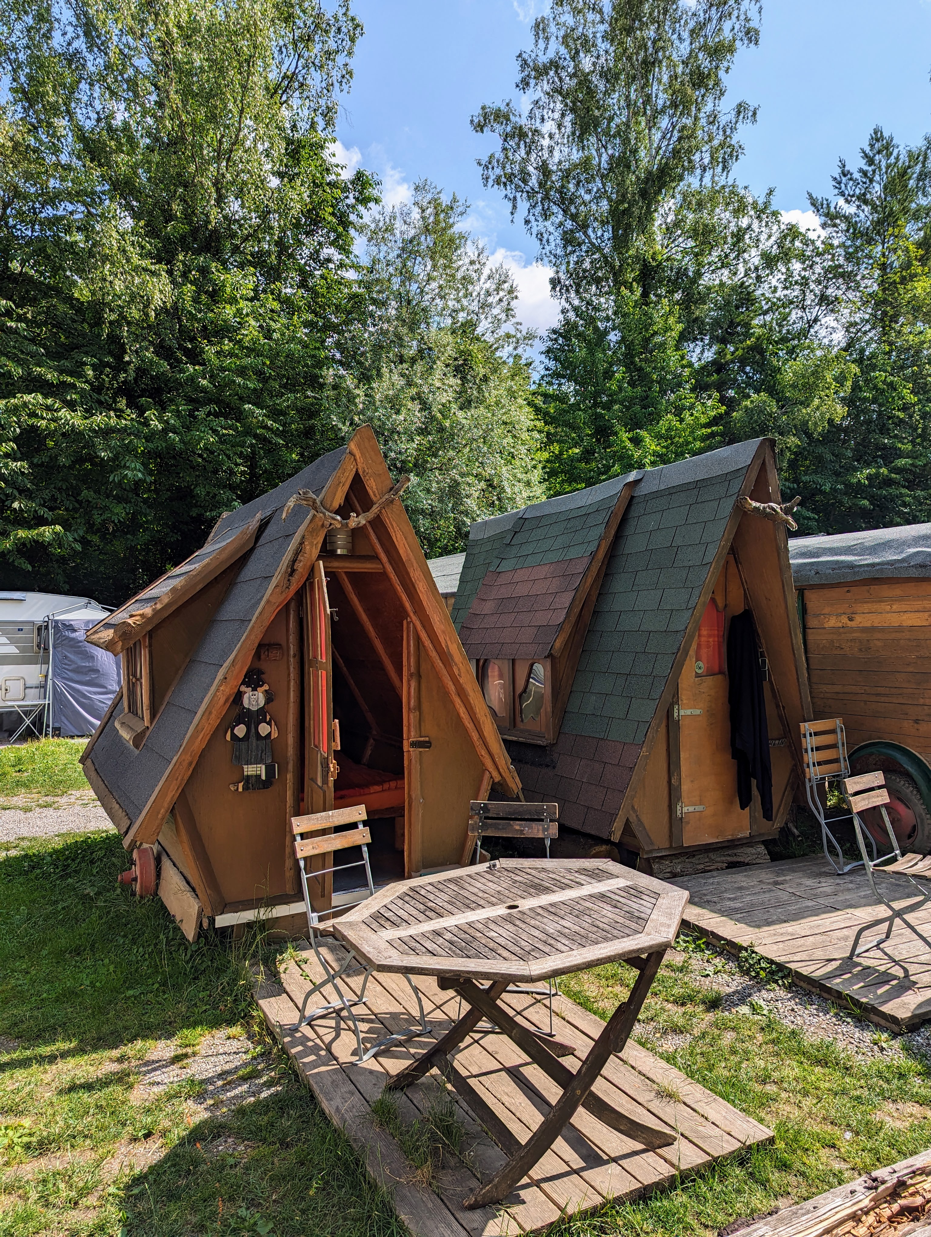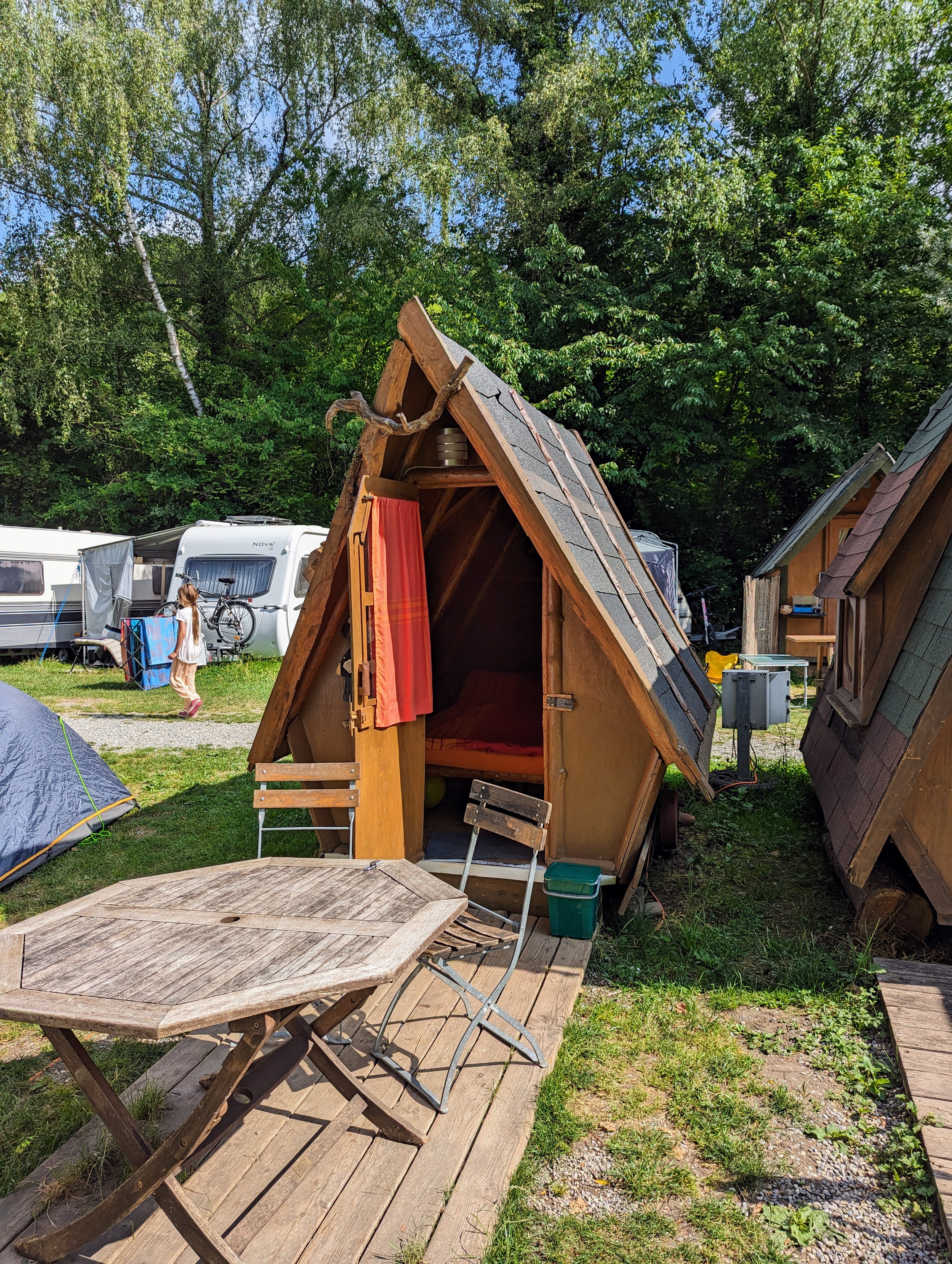 Die Holzhütten haben kein Vorzelt (Holzterrasse)