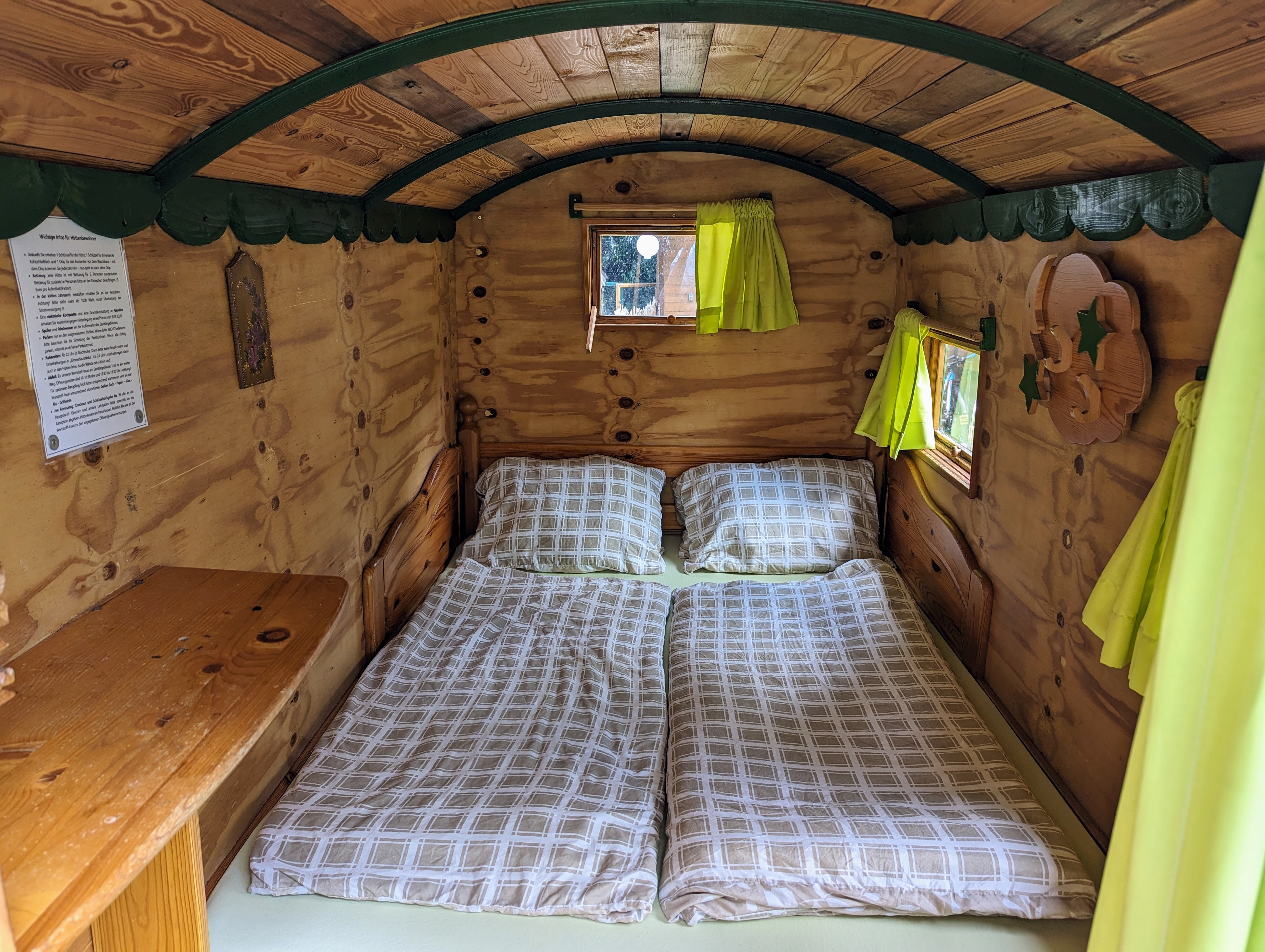 Unser kleiner ca. 100 Jahre alter Schäferwagen Michel (2016 restauriert). Der kleine Michel ist besonders beliebt bei Pärchen und Singles.