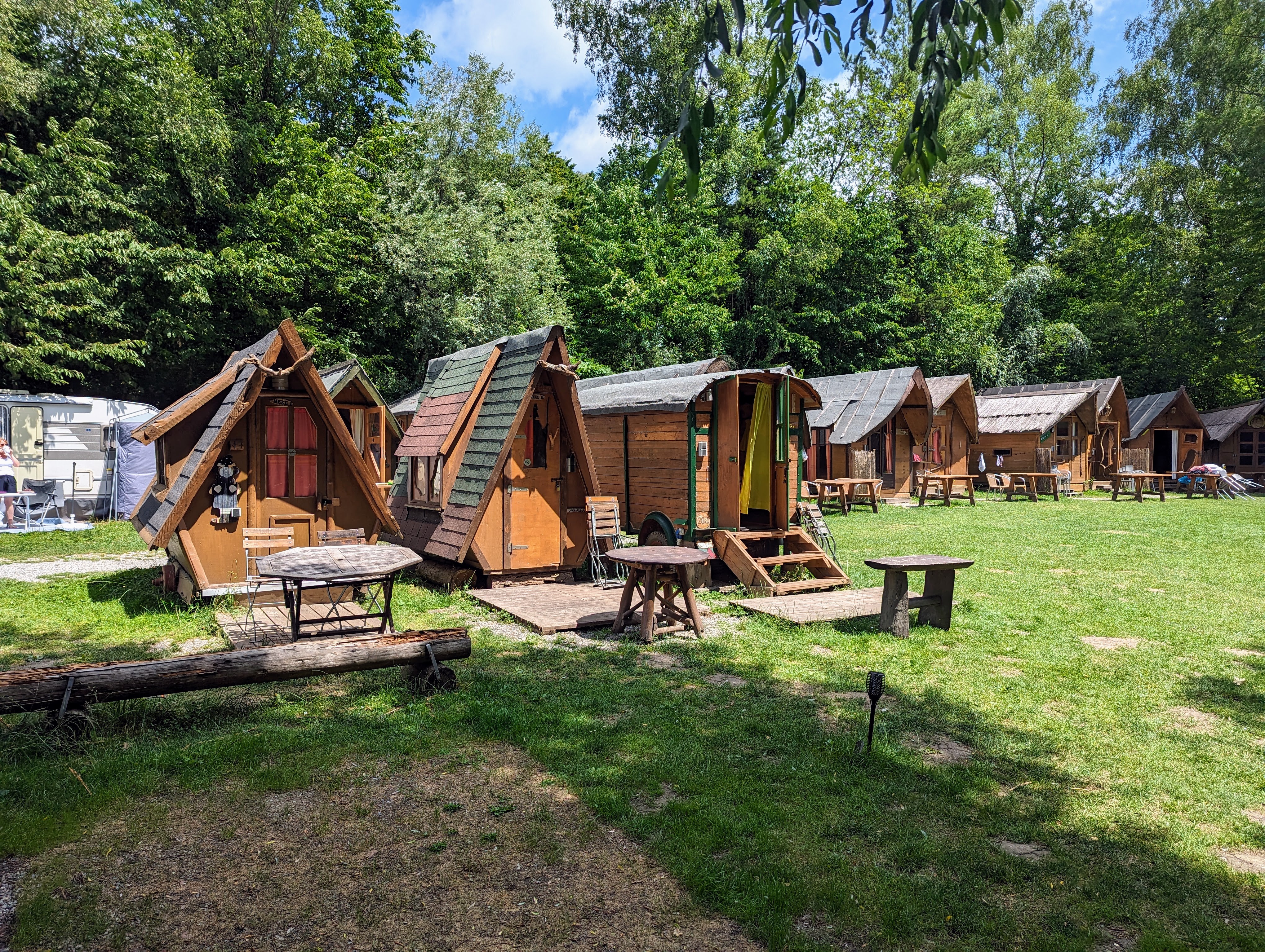 Die Holzhütten haben kein Vorzelt (Holzterrasse)